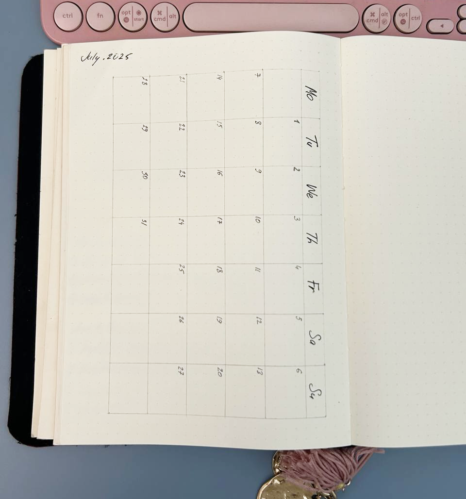 At the beginning of each month, I draw a horizontal calendar across a single page. But I don’t fill out the entire month — only the days that hold important tasks, like project deadlines, meetings, or key events.